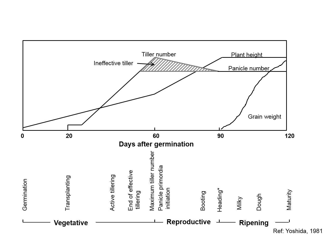 - 식물 성장 단계: 분얼, 식물 높이의 점진적 증가와 잎의 출현(5,6 번째 잎이 생길 때 즈음 분얼이 일어남).